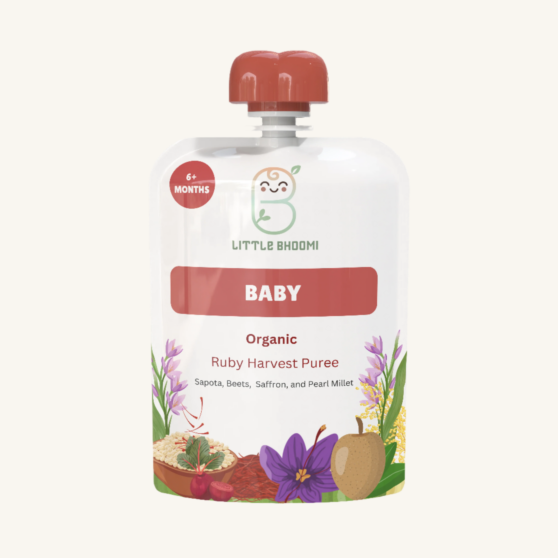 Description: A nourishing blend rooted in ancient wisdom, Ruby Harvest combines sweet sapota and earthy beets with golden saffron — a prized Ayurvedic spice known to support digestion and enhance skin glow. Pearl millet brings gentle grounding energy and iron-rich nourishment, perfect for growing babies aged 6+ months.